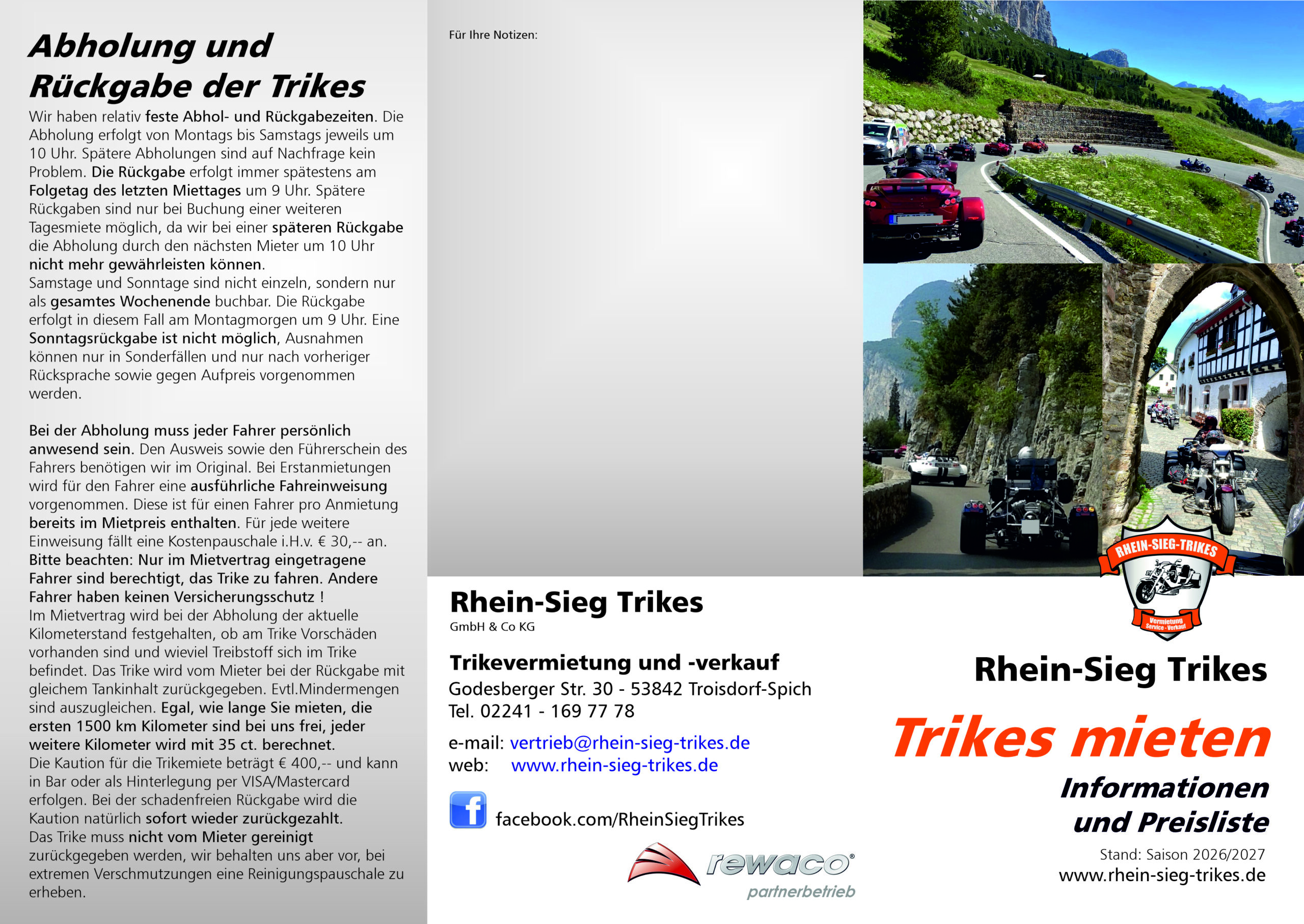 Bitte beachten: Wir nehmen sehr gerne Rücksicht auf Ihre Wünsche, was die Auswahl Ihres Wunschtrikes angeht, bitten aber um Verständnis, dass wir kein spezielles Trike für Sie reservieren können, da die Fahrzeuge immer wieder auch in der laufenden Saison durch neue Modelle ersetzt werden.