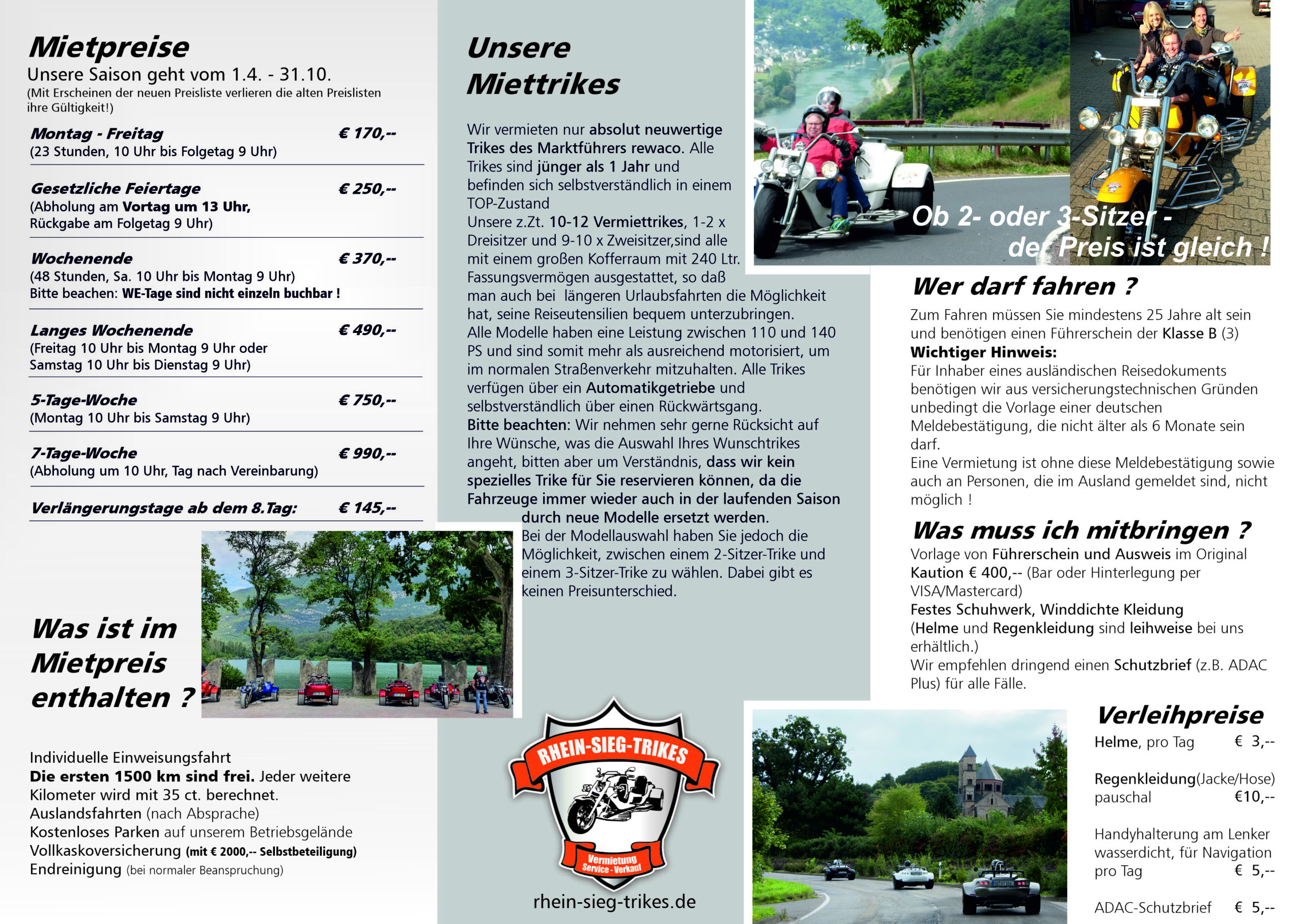 Wir vermieten nur absolut neuwertige Trikes des Marktführers rewaco. Alle Trikes sind jünger als 2 Jahre und befinden sich selbstverständlich in einem TOP-Zustand